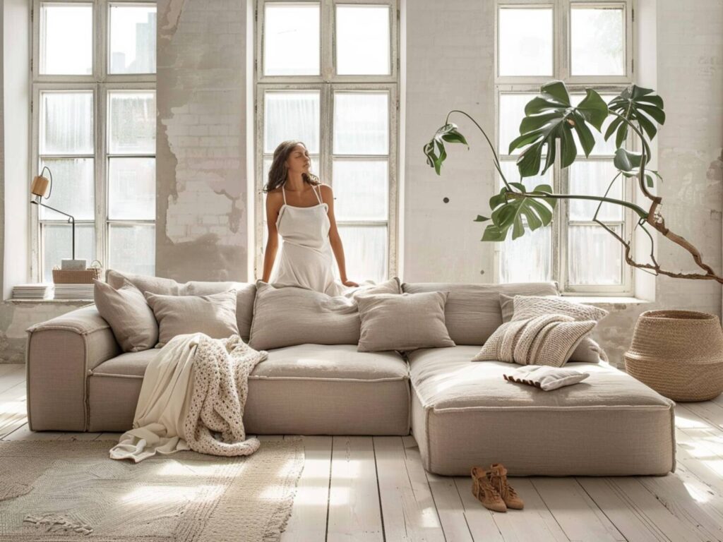 - Minimalistyczne wnętrza z jasnymi kolorami: Narożnik o prostych, geometrycznych formach, utrzymany w jasnych odcieniach szarości i bieli, idealnie kontrastuje z naturalnym drewnem i roślinnymi akcentami, tworząc przestrzeń pełną światła i harmonii.